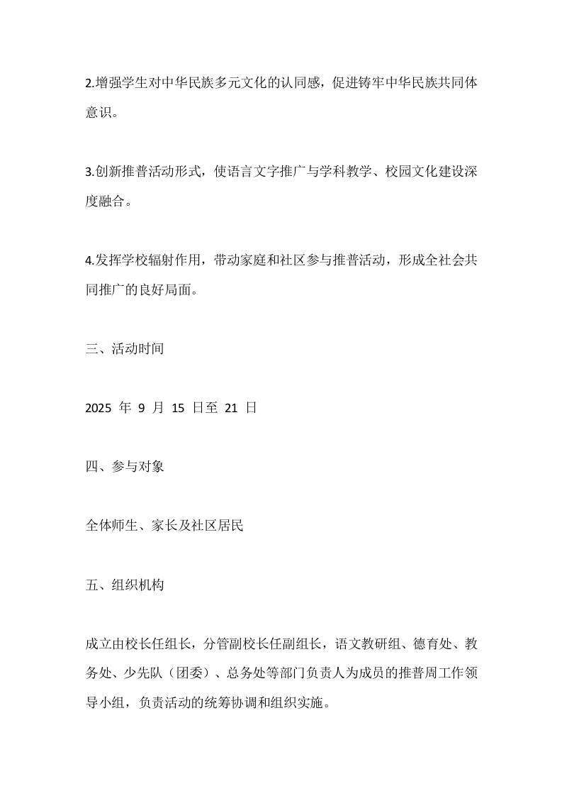 2025年第28届中小学学校“推普周”活动方案:加大国家通用语言文字推广力度,促进铸牢中华民族共同体意识 综合资料 幼师芒果 2025-10-23 教务 资源下载下载价格1.8 下载币VIP免费升级VIP立即购买 ——预览已结束,还剩6页未读——开通会员后可免费下载高清完整文档 阅读全文