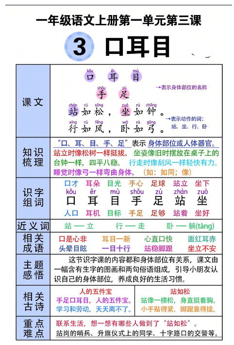 《一年级上册语文重点知识总结课课贴彩色版》