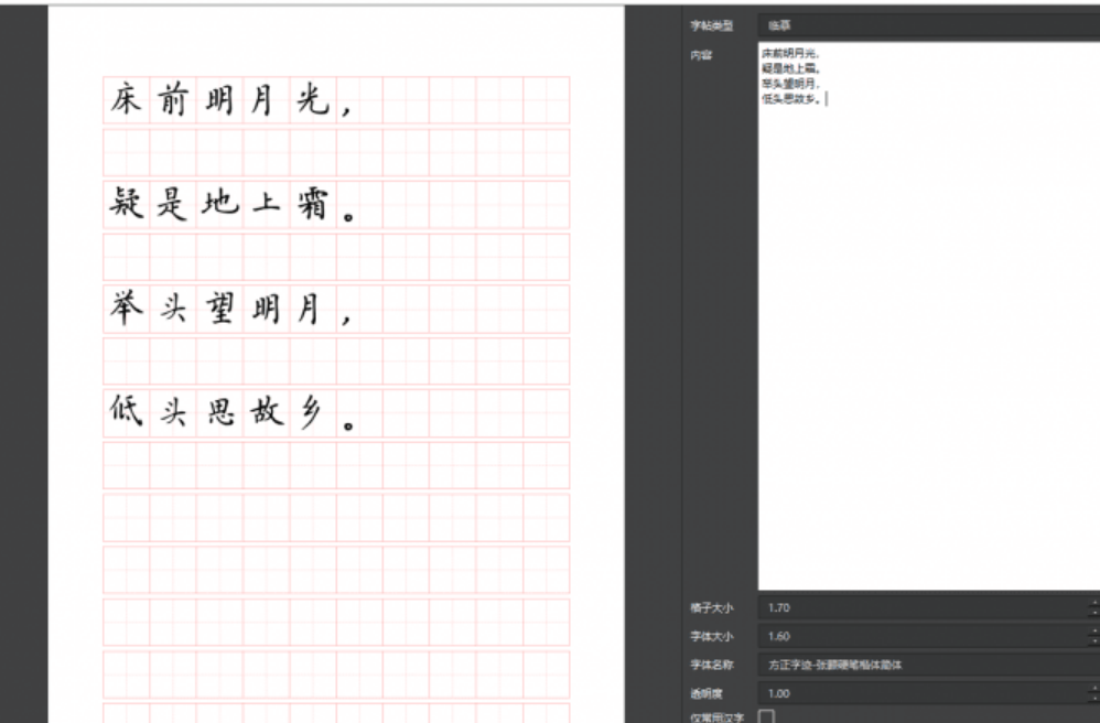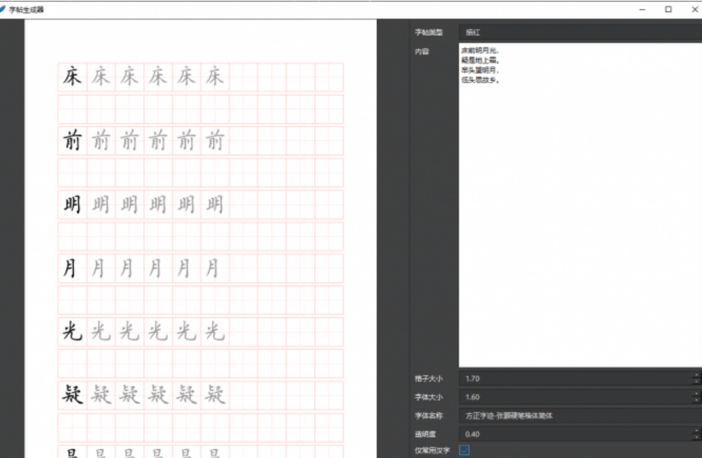 【2025最新版】中小学语文超强字帖生成器【终身免费版】 不限 王赞 2025-10-27 特色培训 资源下载下载价格1.6 下载币VIP免费升级VIP立即购买 升级啦!全国最新字帖生成器来啦,终身免费版本2025! 支持描红和临摹两种模式 可调整田字格和字体大小 字体需自行安装字体到系统 透明度: 文字透明度 常用汉字: 勾选后仅显示[0x4E00, 0x9fff]范围的unicode字符 附件空行: 每一行后面自动添加空行 描字类型: 描红模式下有效, 支持不描、半描和全描 导出为PDF文件 阅读全文