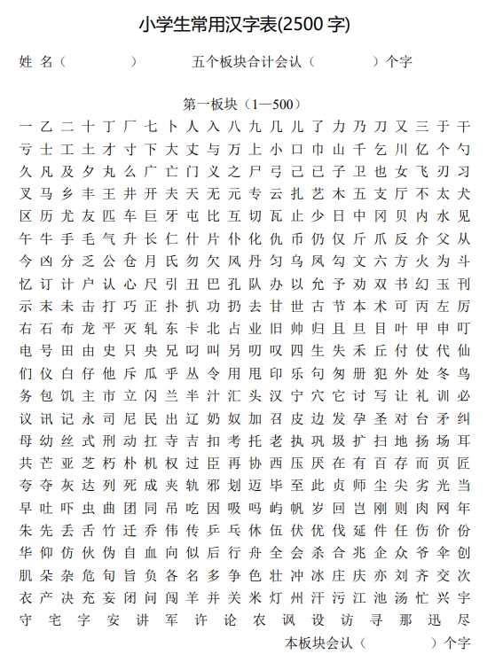 6页打包!一年级识字量测试表(2500字家长版),电子版PDF可打印【超高质量】