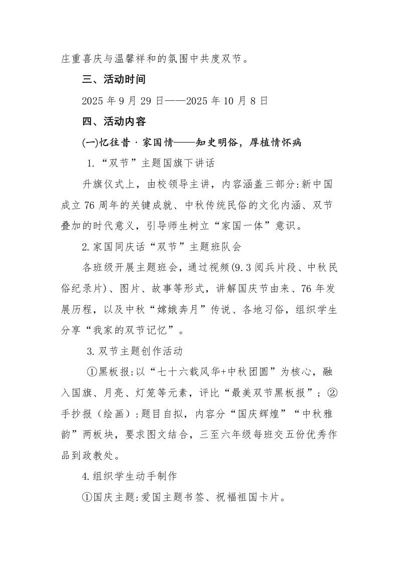 2025年“寄情中秋,喜迎国庆”中秋国庆双节活动方案:76载风华映山河双节同庆家国梦 综合资料 王赞 2025-10-19 教务 资源下载下载价格1.2 下载币VIP免费升级VIP立即购买 ——预览已结束,还剩2页未读——开通会员后可免费下载高清完整文档 阅读全文