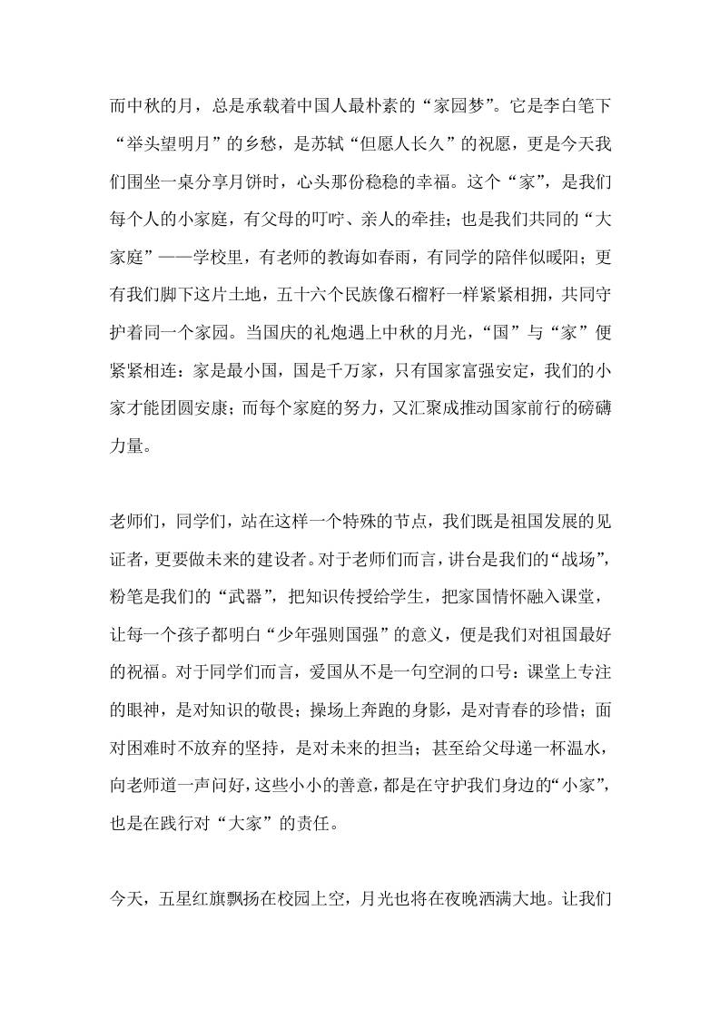 中秋国庆双节,校长在国旗下的讲话:七十六载普华诞双节共庆家园梦 综合资料 雄鹰老师 2025-10-19 教务 资源下载下载价格0.8 下载币VIP免费升级VIP立即购买 ——预览已结束,还剩1页未读——开通会员后可免费下载高清完整文档 阅读全文