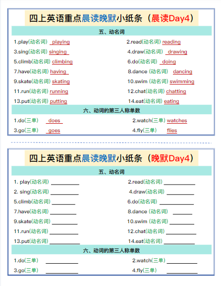四上英语期末(通用版)重点晨读晚默小纸条