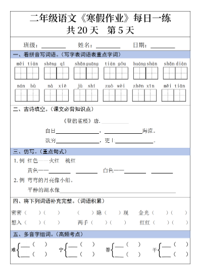 2025二年级语文寒假作业每日一练(完整20天)20页