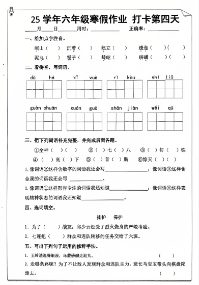 六年级【语文寒假作业】每日打卡20天(含答案66页)
