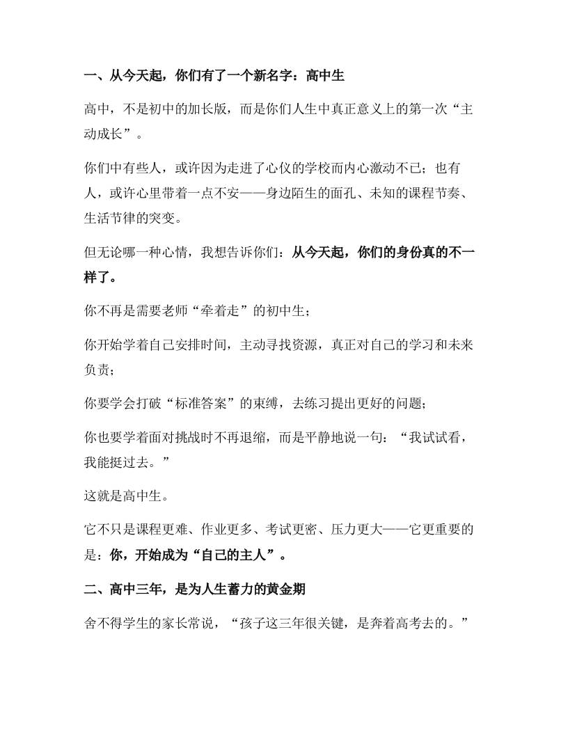 2025级高一新生见面会上,校长讲话:欢迎共赴这一场,关于青春、成长与蜕变的盛大旅程! 综合资料 幼师郝雪 2025-10-17 教务 资源下载下载价格1.2 下载币VIP免费升级VIP立即购买 ——预览已结束,还剩5页未读——开通会员后可免费下载高清完整文档 阅读全文