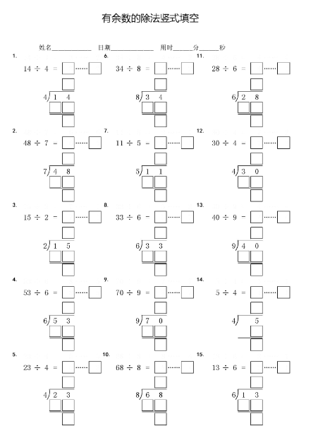 《2025春新课改二下数学【有余数的除法】竖式填空填方框专项练习》 专项练习 2025-10-28 二年级 资源下载下载价格1.8 下载币VIP免费升级VIP立即购买 本页为资源截图试看,VIP会员免费下载,同时VIP会员可以打包下载 阅读全文