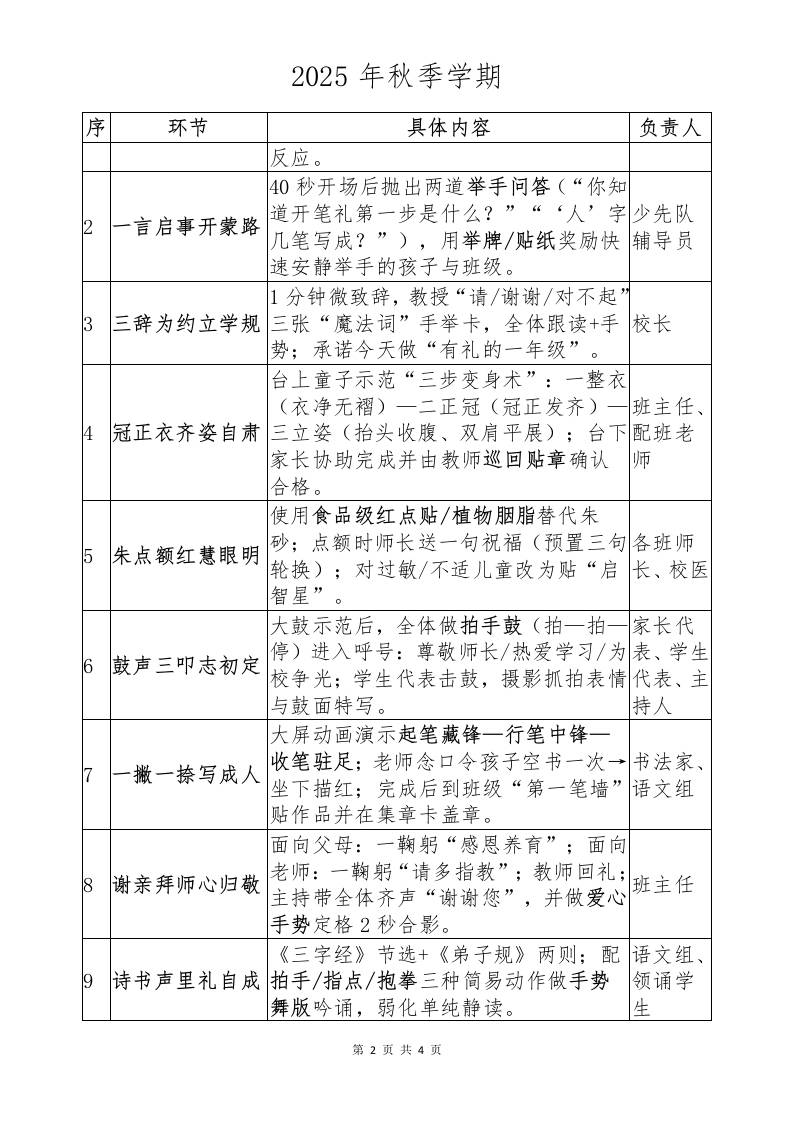2025年秋季一年级开笔礼活动方案:一撇一捺立初心,一笔一画启新程 综合资料 幼师李老师 2025-10-17 教务 资源下载下载价格0.8 下载币VIP免费升级VIP立即购买 ——预览已结束,还剩2页未读——开通会员后可免费下载高清完整文档 阅读全文