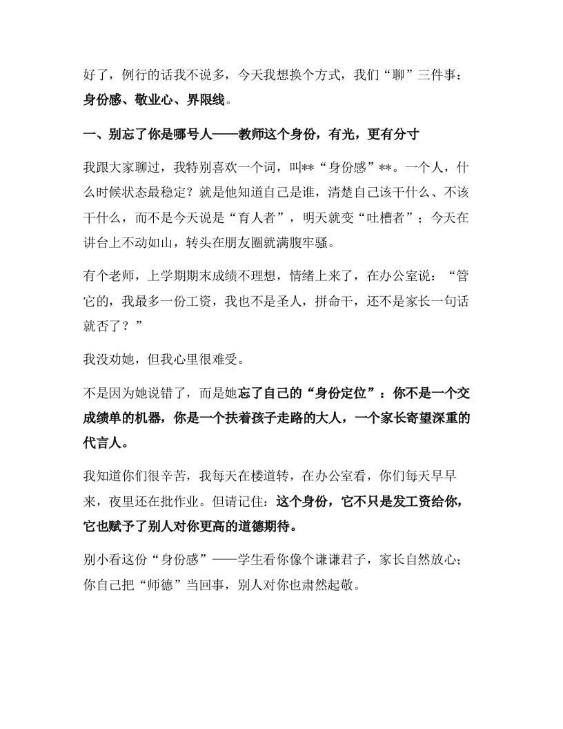 师德师风专题培训会上,校长讲话:站好讲台人,守住教育心——做学生敬重、家长信任、同事佩服的那种好老师! 综合资料 幼师常 2025-10-15 教务 资源下载下载价格0.8 下载币VIP免费升级VIP立即购买 ——预览已结束,还剩4页未读——开通会员后可免费下载高清完整文档 阅读全文