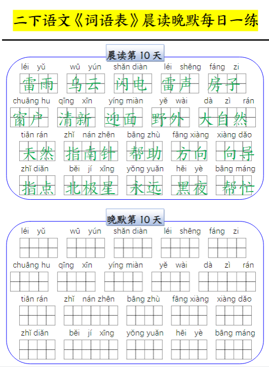 二(下)语文 寒假预习:词语表晨读晚默每日一练