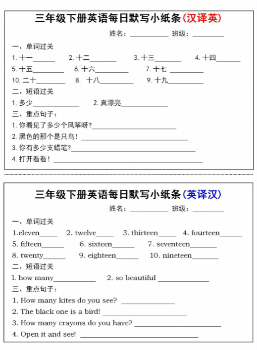 三年级下册英语每日默写小纸条(汉译英)纯图版