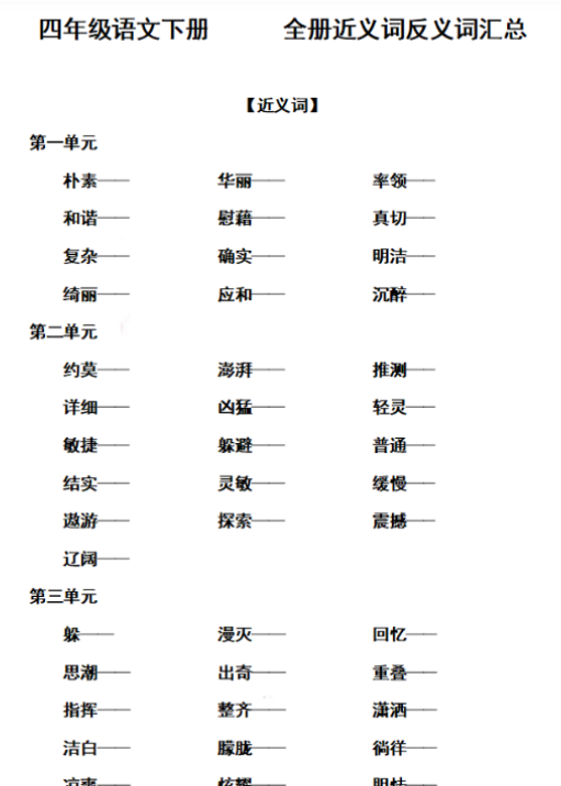 【高清电子版】四(下)语文: 全册近义词反义词汇总(空白版) 不限 栀晴 2025-03-20 四年级 资源下载下载价格1.6 下载币VIP免费升级VIP立即购买 本页为资源截图试看,VIP会员免费下载,同时VIP会员可以打包下载 阅读全文