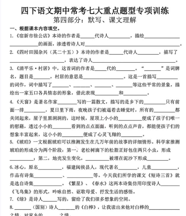 四下语文期中常考七大重点题型专项训练 (含答案30页)