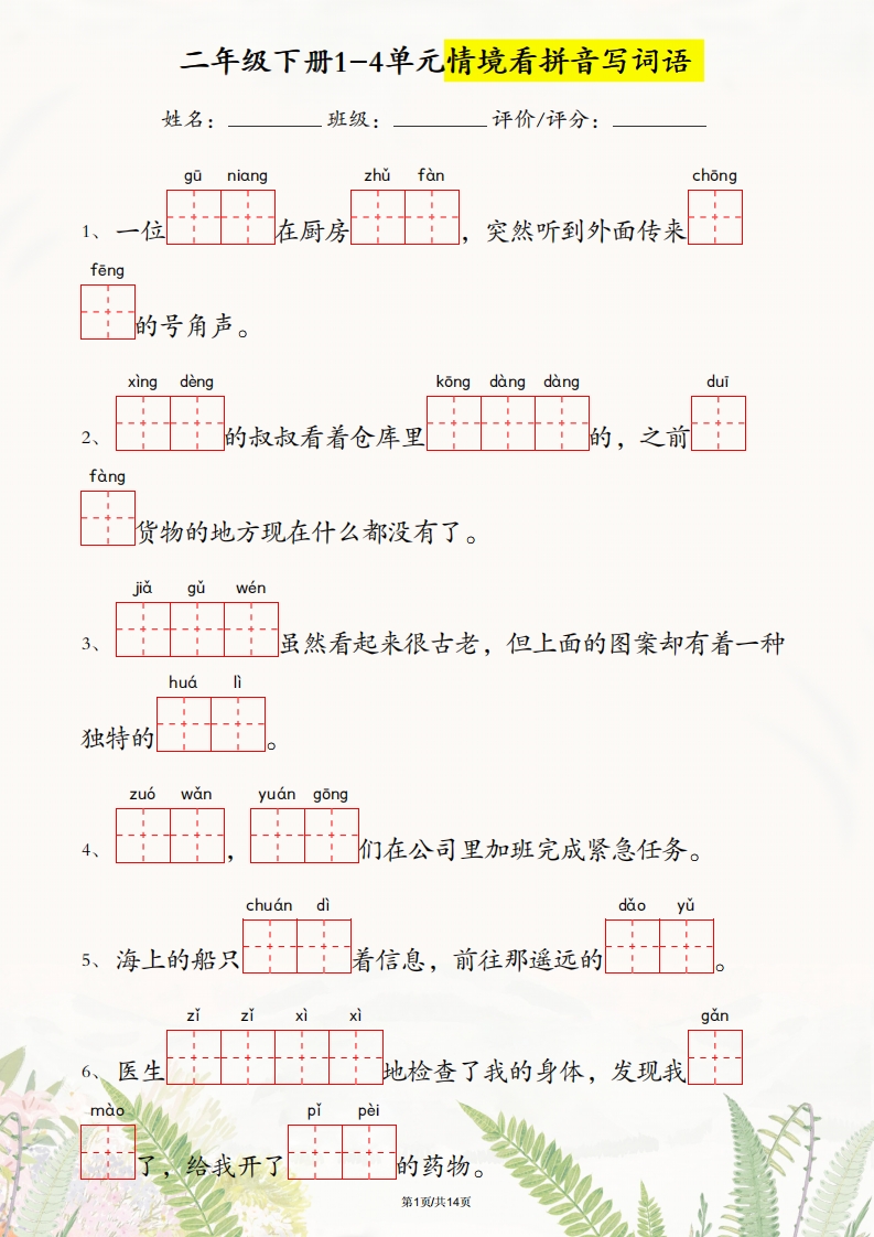 二年级下册语文1-4单元情境看拼音写词语 综合资料 2024-04-17 二年级 资源下载下载价格0.8 下载币VIP免费升级VIP立即购买 ——预览已结束,还剩12页未读——开通会员后可免费下载高清完整文档 阅读全文