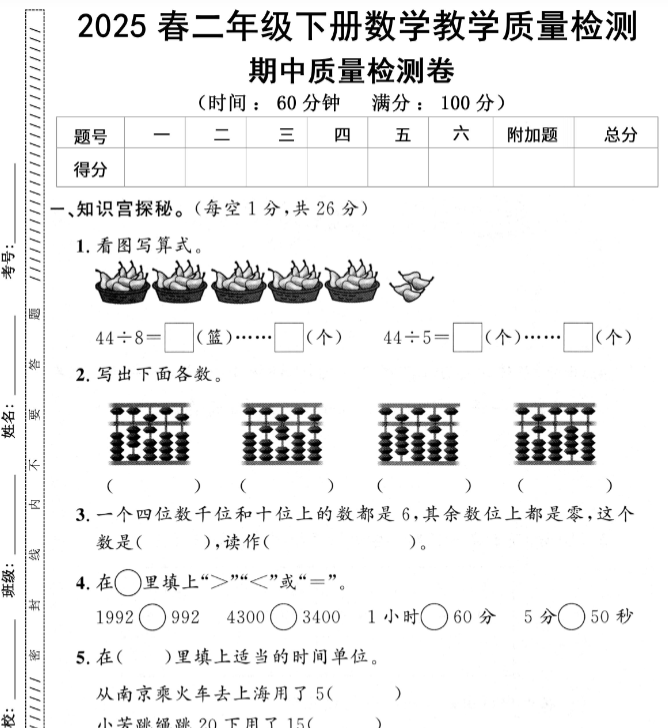 【新版期中打包5套】小学二年级下册数学期中考试卷(苏教版)