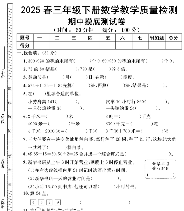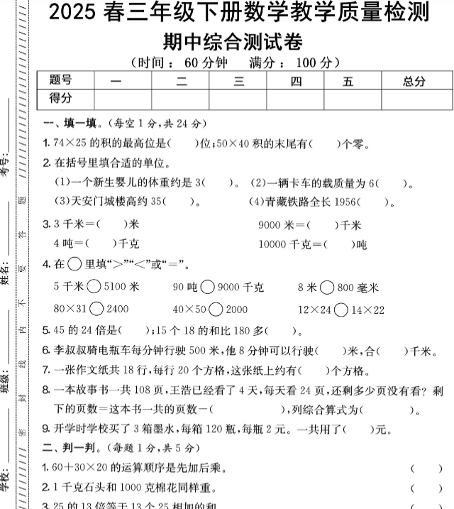 【新版期中打包5套】小学三年级下册数学期中考试卷(苏教版)