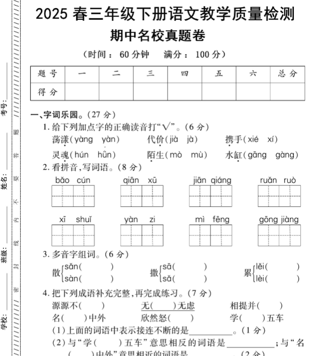 【新版期中打包5套】小学三年级下册语文期中考试卷(通用版)