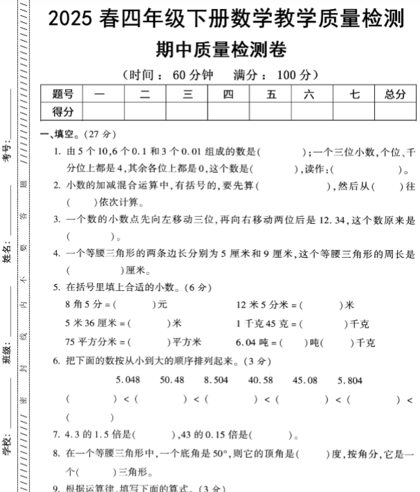 【新版期中打包5套】小学四年级下册数学期中考试卷(人教版)
