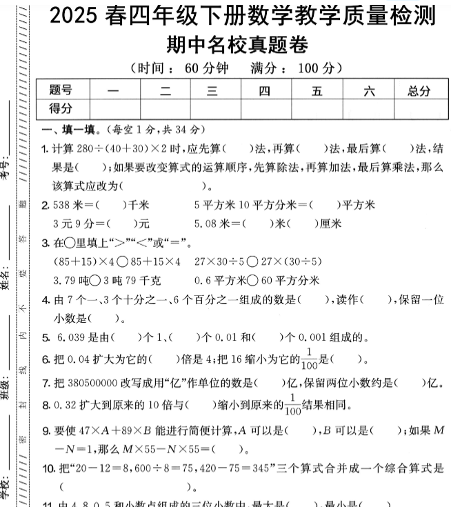 【新版期中打包5套】小学四年级下册数学期中考试卷(人教版)