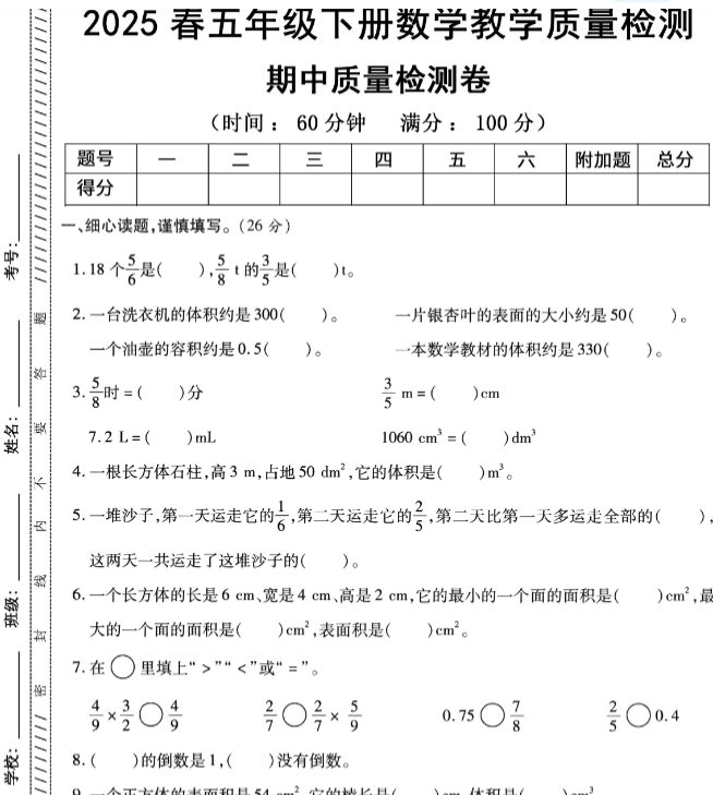 【新版期中打包5套】小学五年级下册数学期中考试卷(北师版)