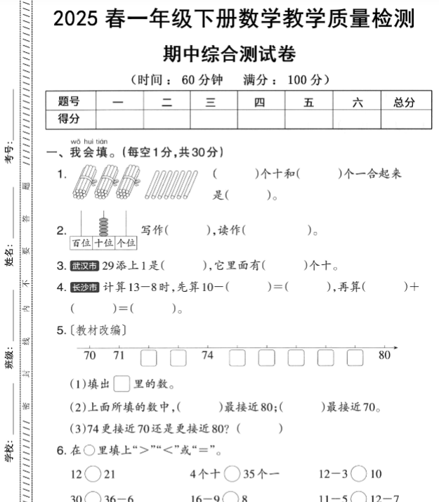 【新版期中打包5套】小学一年级下册数学期中考试卷(苏教版)