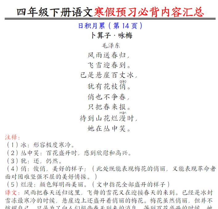 10页统编版语文4年级下册课文必背内容汇总(课文、古诗、日积月累)