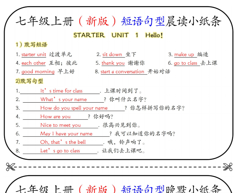 26页!七年级上册(新版)短语句型晨读小纸条【完整版】 小纸条 幼师李老师 2025-10-28 七年级 资源下载下载价格1.8 下载币VIP免费升级VIP立即购买 本页为资源截图试看,VIP会员免费下载,同时VIP会员可以打包下载 阅读全文