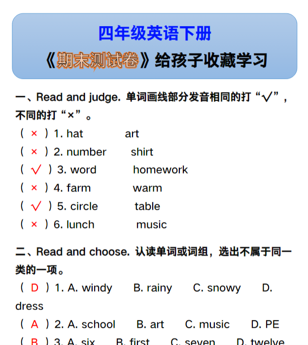 6份!最新四年级下册英语期末精品试卷资料打包下载【高清无水印+可编辑】