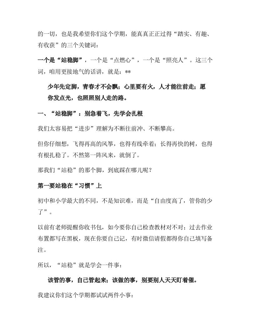 校长在2025年秋季开学典礼上的讲话:新学期,让成长有“根”,有“火”,也有“光”! 综合资料 幼师李老师 2025-10-11 教务 资源下载下载价格1.8 下载币VIP免费升级VIP立即购买 ——预览已结束,还剩4页未读——开通会员后可免费下载高清完整文档 阅读全文