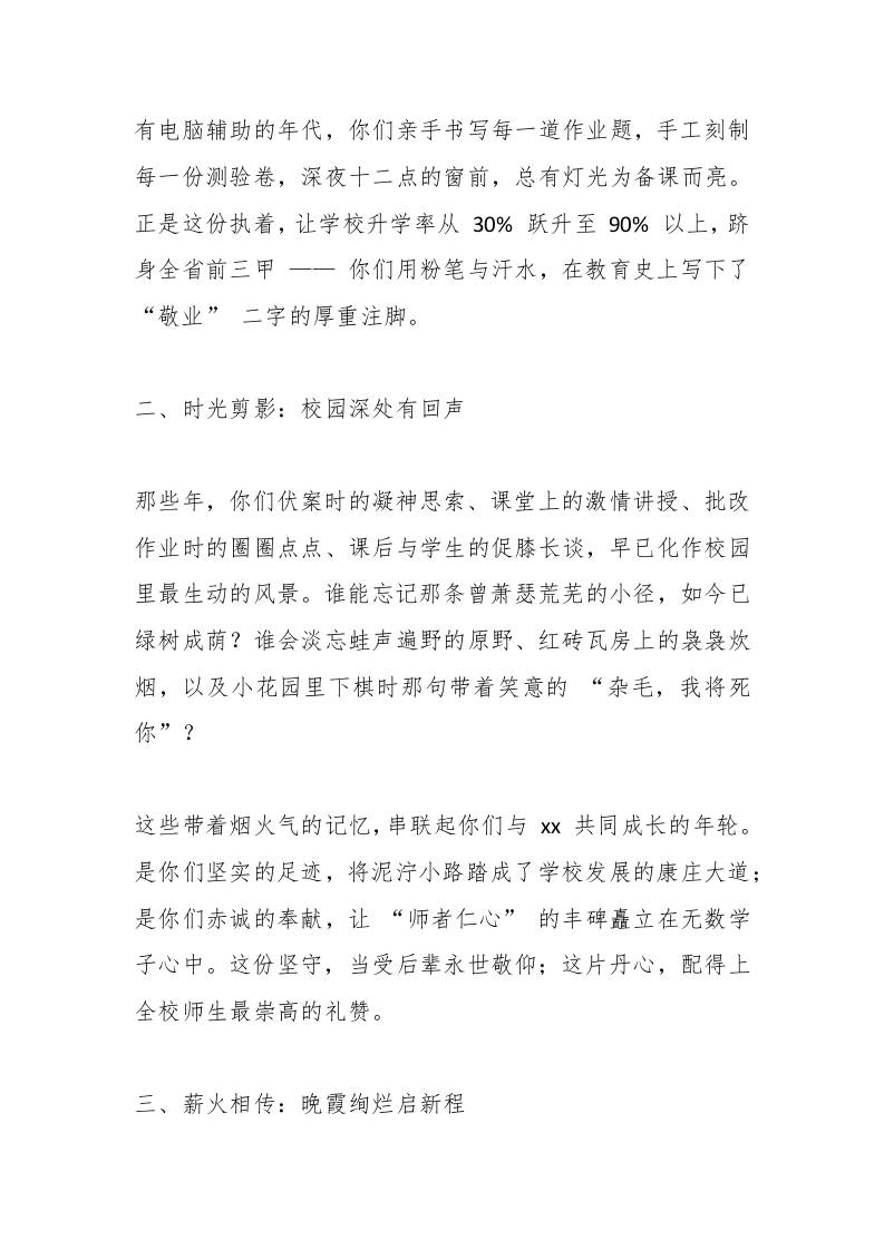 校长在退休教师欢送仪式上讲话:你们的当下,便是我们的未来;你们的安康,便是我们最大的心愿 综合资料 幼师李老师 2025-10-10 教务 资源下载下载价格1.8 下载币VIP免费升级VIP立即购买 ——预览已结束,还剩2页未读——开通会员后可免费下载高清完整文档 阅读全文