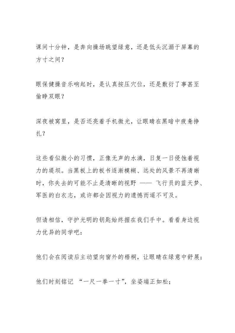 全国爱眼日,校长在国旗下讲话:守护心灵之窗 综合资料 王赞 2025-10-10 教务 资源下载下载价格1.8 下载币VIP免费升级VIP立即购买 ——预览已结束,还剩4页未读——开通会员后可免费下载高清完整文档 阅读全文