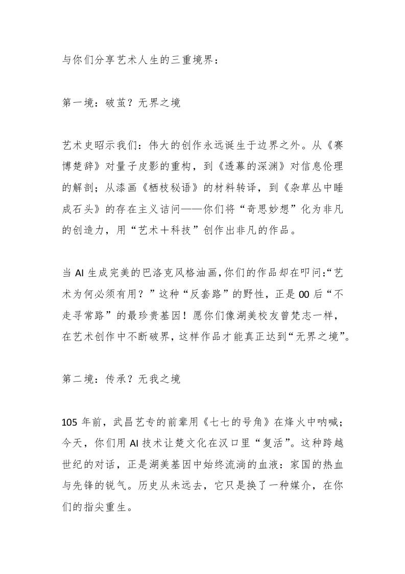 在2025届本科生毕业作品展开幕式上的致辞:无界之境无我之境无畏之境 综合资料 栀晴 2025-10-09 教务 资源下载下载价格1.8 下载币VIP免费升级VIP立即购买 ——预览已结束,还剩2页未读——开通会员后可免费下载高清完整文档 阅读全文
