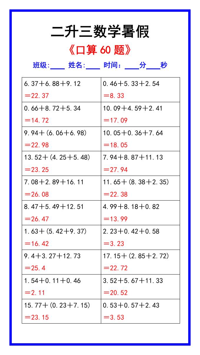 二升三数学暑假《口算练习60题》汇总-三上数学 专项练习 幼师PPT 2025-10-28 三年级 资源下载下载价格1.2 下载币VIP免费升级VIP立即购买 ——预览已结束,还剩2页未读——开通会员后可免费下载高清完整文档 阅读全文