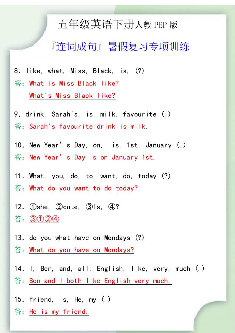 五年级英语下册『连词成句』暑假复习专项训练 暑假 2025-10-28 五年级 资源下载下载价格1.8 下载币VIP免费升级VIP立即购买 ——预览已结束,还剩2页未读——开通会员后可免费下载高清完整文档 阅读全文