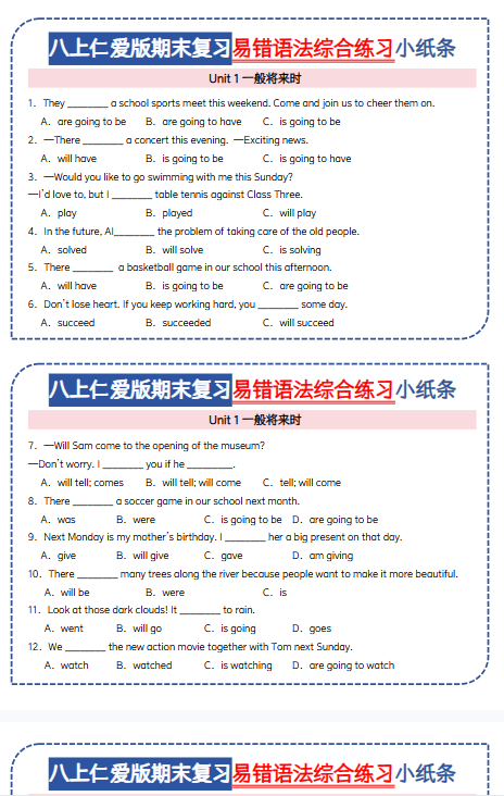 【仁爱版初中八上英语期末精品小纸条】【高清无水印版本】