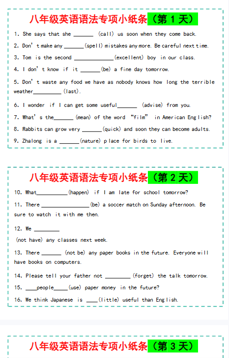 【仁爱版初中八上英语语法短文精品小纸条】【高清无水印版本】