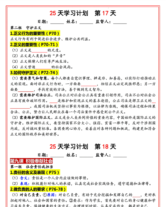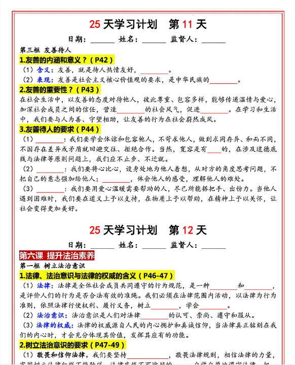 新版八年级上册道法(人教版)25天学习计划(填空版)