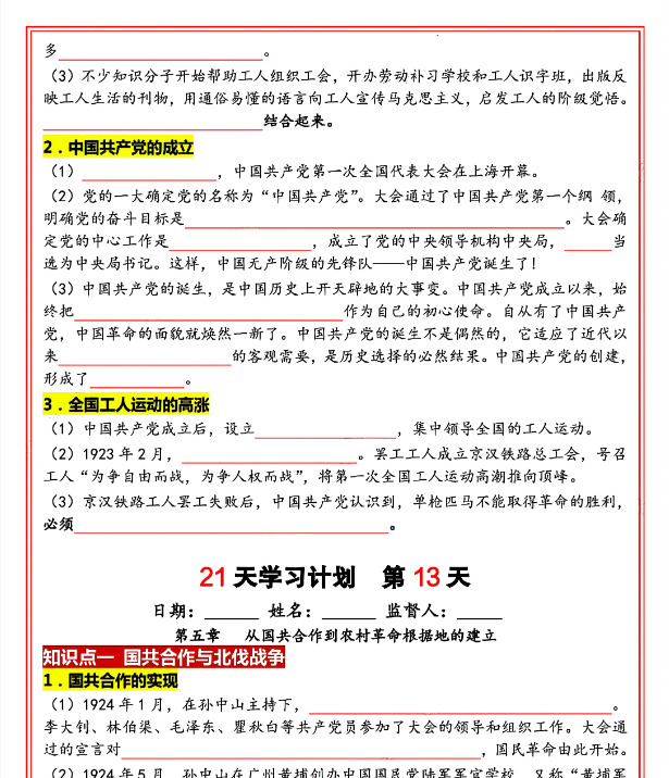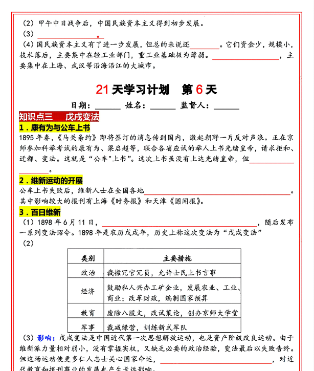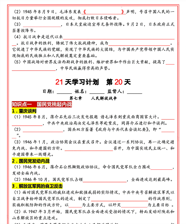 新版八年级上册历史(人教版)21天学习计划(空白版)