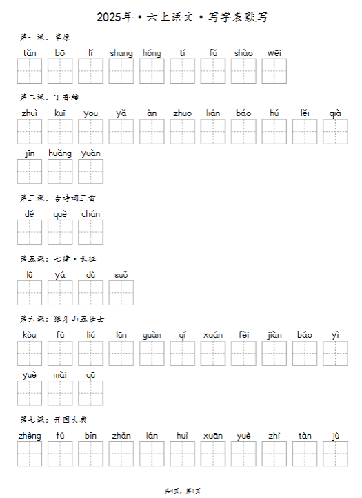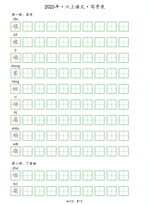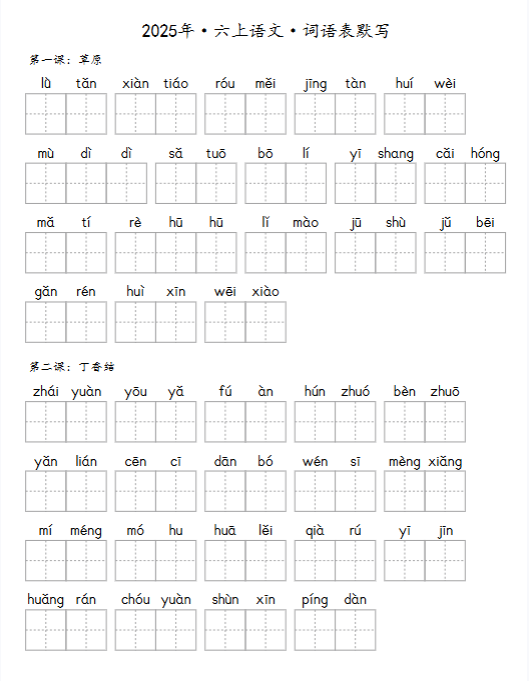 2025秋六上《识字表》《写字表》《词语表》抄写默写