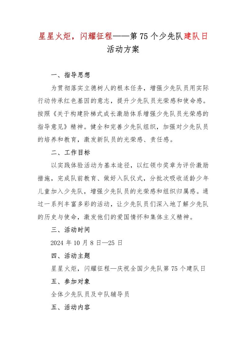 星星火炬,闪耀征程——第75个少先队建队日活动方案 综合资料 雄鹰老师 2025-10-03 教务 资源下载下载价格1.8 下载币VIP免费升级VIP立即购买 ——预览已结束,还剩3页未读——开通会员后可免费下载高清完整文档 阅读全文