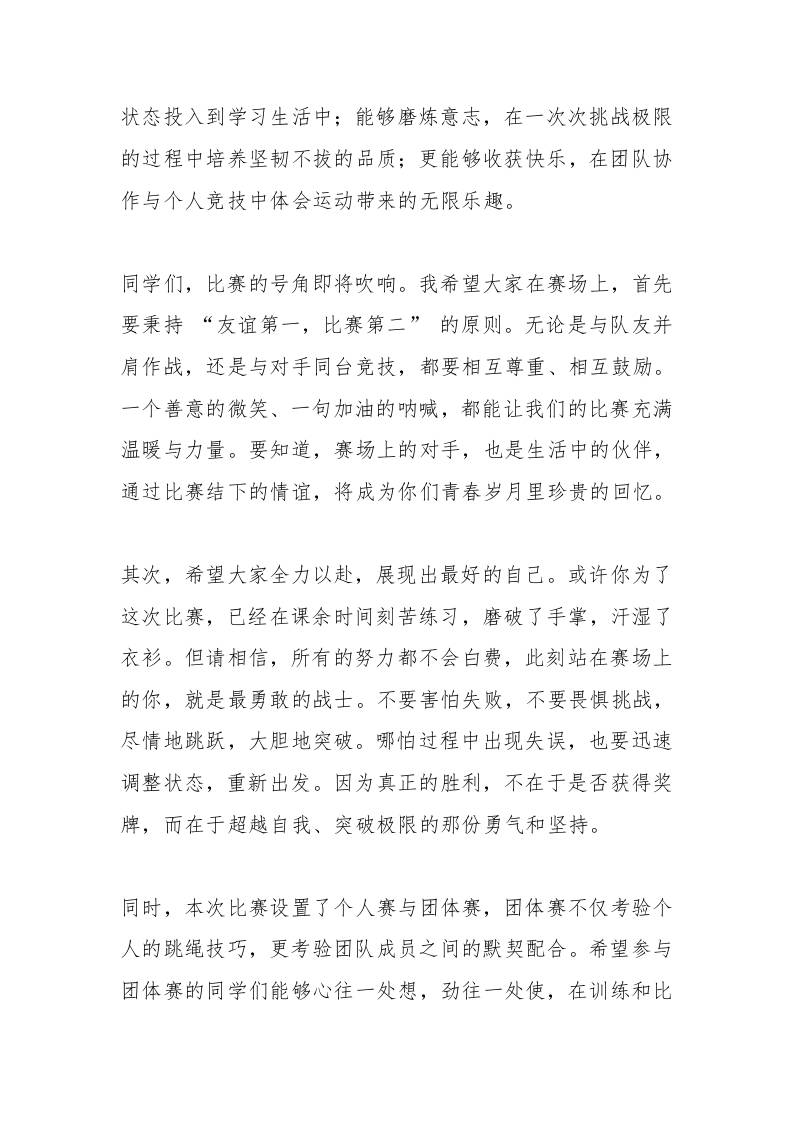 校长在学校跳绳比赛上的讲话:赛出风格、赛出属于自己的精彩 综合资料 幼师酸奶 2025-10-03 教务 资源下载下载价格1.8 下载币VIP免费升级VIP立即购买 ——预览已结束,还剩1页未读——开通会员后可免费下载高清完整文档 阅读全文