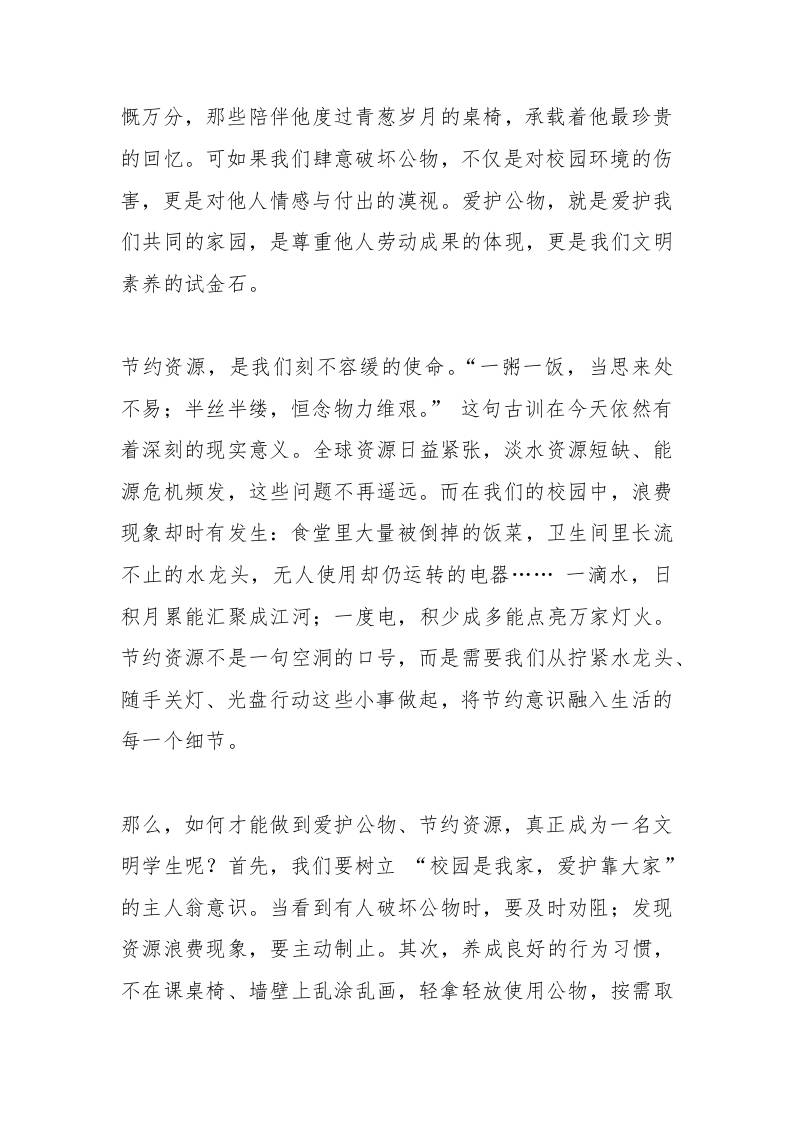 校长在国旗下讲话:爱护公物节约资源争做文明学生 综合资料 刘波老师 2025-10-02 教务 资源下载下载价格1.2 下载币VIP免费升级VIP立即购买 ——预览已结束,还剩1页未读——开通会员后可免费下载高清完整文档 阅读全文