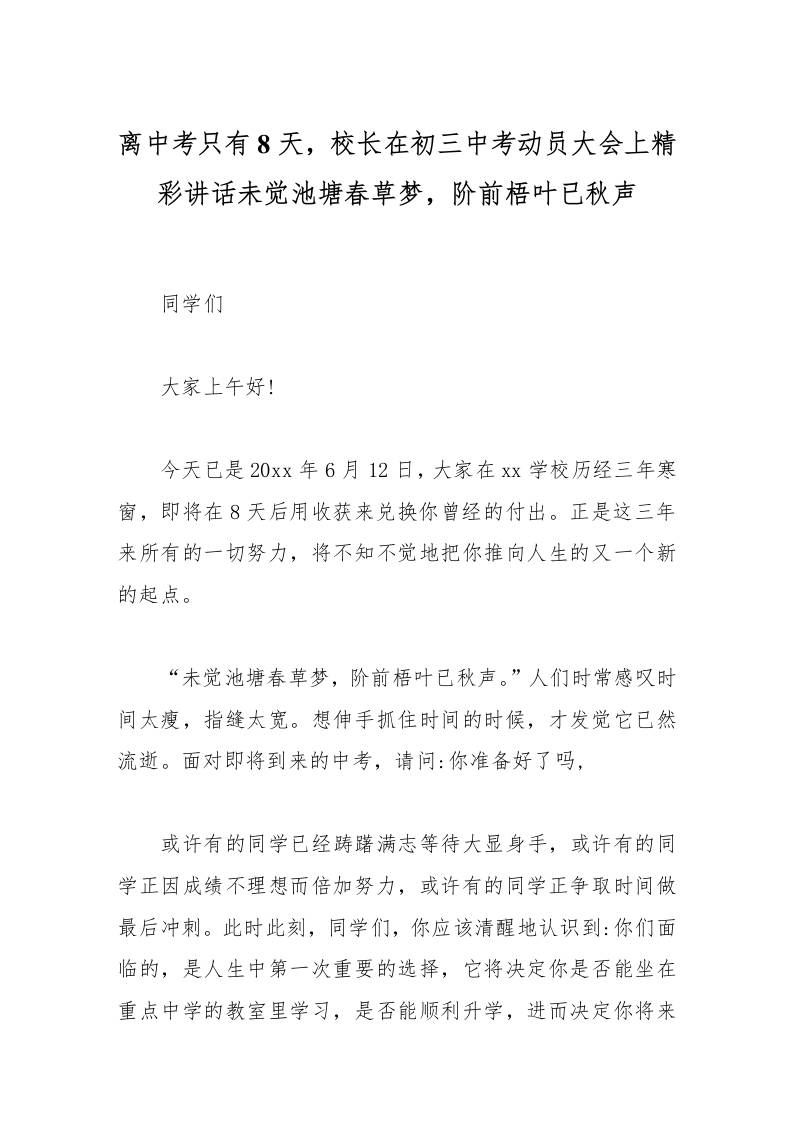 离中考只有8天,校长在初三中考动员大会上精彩讲话未觉池塘春草梦,阶前梧叶已秋声 综合资料 幼师王老师 2025-09-29 教务 资源下载下载价格1.2 下载币VIP免费升级VIP立即购买 ——预览已结束,还剩2页未读——开通会员后可免费下载高清完整文档 阅读全文