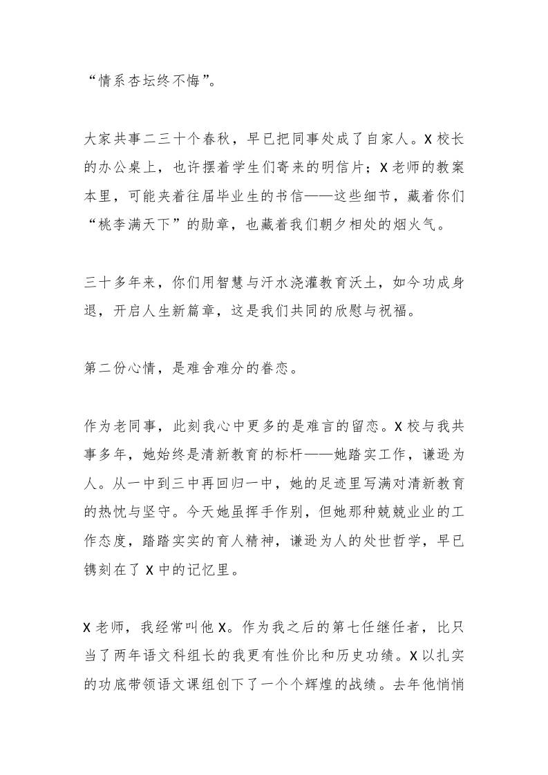 在X校长、X老师荣休欢送会上的讲话:三重心情贺同事荣休 综合资料 幼师郝雪 2025-09-27 教务 资源下载下载价格0.8 下载币VIP免费升级VIP立即购买 ——预览已结束,还剩2页未读——开通会员后可免费下载高清完整文档 阅读全文