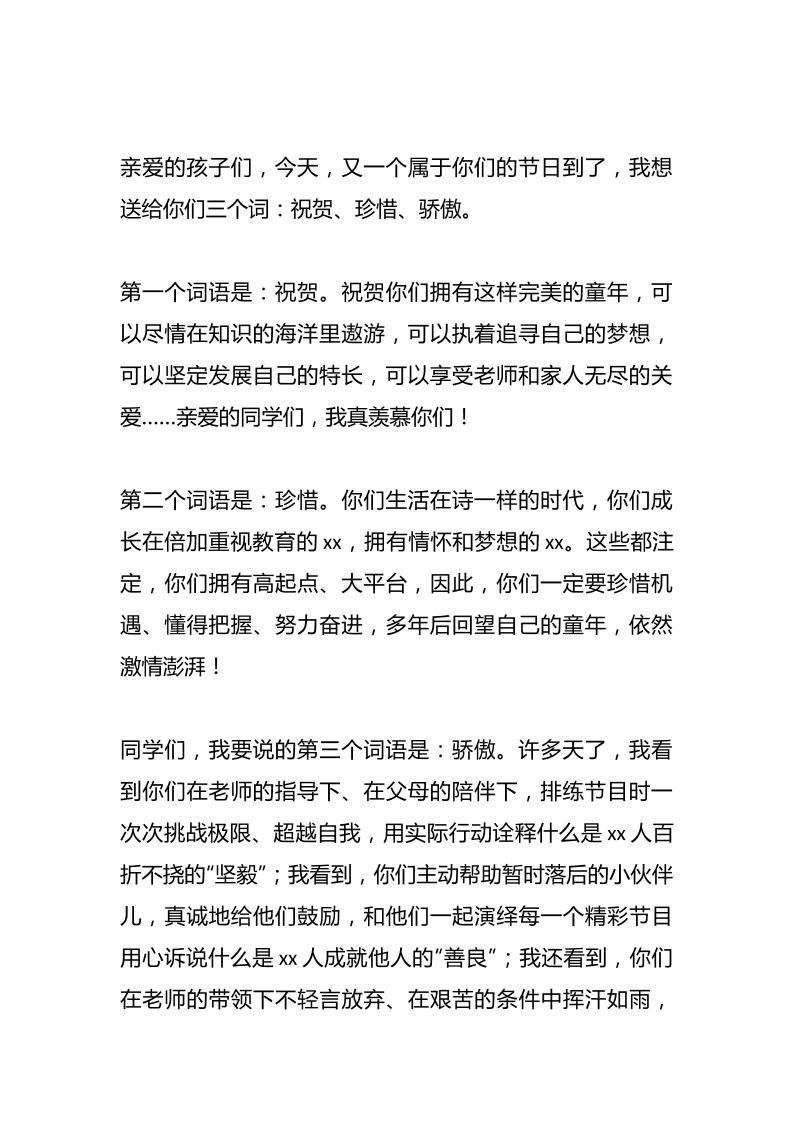 六一儿童节校长讲话,送给同学们3个关键词:祝贺、珍惜、骄傲。 综合资料 栀晴 2025-09-27 教务 资源下载下载价格1.2 下载币VIP免费升级VIP立即购买 ——预览已结束,还剩1页未读——开通会员后可免费下载高清完整文档 阅读全文