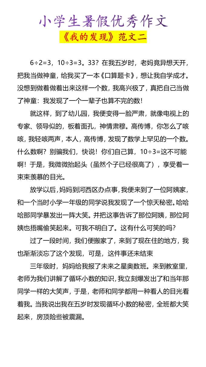小学生暑假优秀作文《我的发现》范文4篇-小升初语文 暑假 幼师酸奶 2025-10-24 小升初 资源下载下载价格0.8 下载币VIP免费升级VIP立即购买 ——预览已结束,还剩2页未读——开通会员后可免费下载高清完整文档 阅读全文