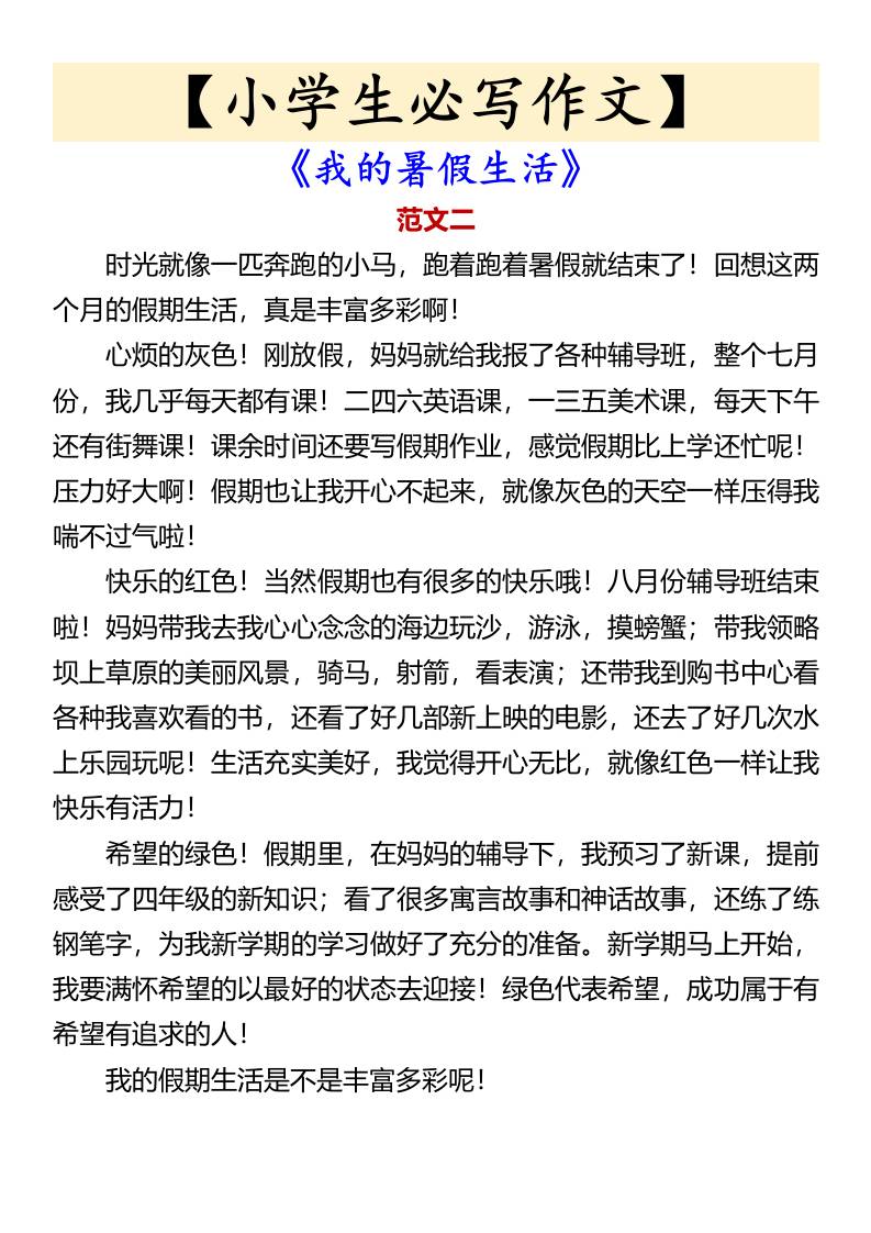 【小学生必写作文】《我的暑假生活》-小升初语文 暑假 幼师优势 2025-10-25 小升初 资源下载下载价格0.8 下载币VIP免费升级VIP立即购买 ——预览已结束,还剩1页未读——开通会员后可免费下载高清完整文档 阅读全文