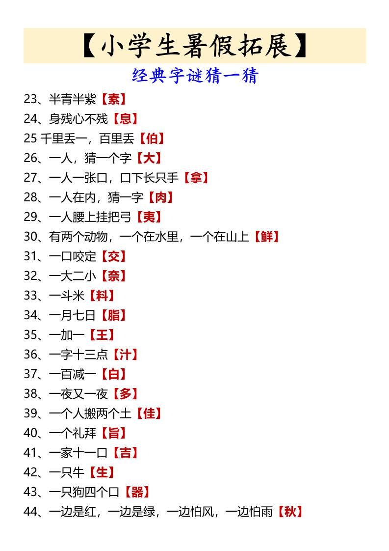【小学生暑假拓展】经典字谜猜一猜-小升初语文 暑假 幼师酸奶 2025-10-25 小升初 资源下载下载价格1.8 下载币VIP免费升级VIP立即购买 ——预览已结束,还剩1页未读——开通会员后可免费下载高清完整文档 阅读全文