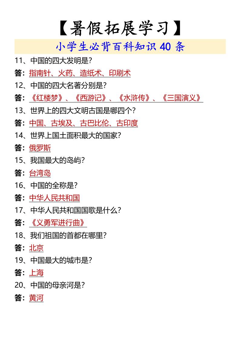 【暑假拓展学习】小学生必背百科知识40条-小升初语文 知识点 栀晴 2025-10-25 小升初 资源下载下载价格1.8 下载币VIP免费升级VIP立即购买 ——预览已结束,还剩2页未读——开通会员后可免费下载高清完整文档 阅读全文