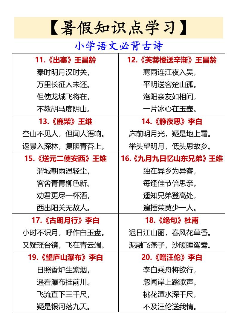 【暑假知识点学习】小学语文必背古诗-小升初语文 知识点 幼师王老师 2025-10-25 小升初 资源下载下载价格1.2 下载币VIP免费升级VIP立即购买 ——预览已结束,还剩1页未读——开通会员后可免费下载高清完整文档 阅读全文